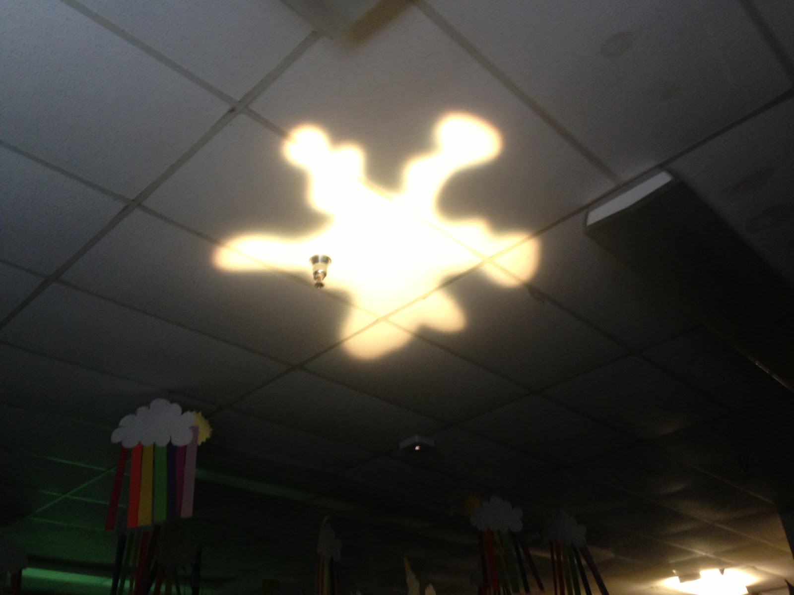An old fashioned overhead projector and cut out shapes, a block so the projector can reach the ceiling, lay back and pretend